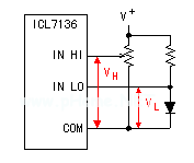 ICL7136 有“高”、“低”两个输入端子,还有一个“地(COM)”端。这个COM端与电源的负极不同,它与芯片内部相连构成参考电压的地。在测量输入电压时,是测量"IN HI"和"IN LO"之间的电位差。如左图所示,参“HI”和“LO”之间的电位差为VH-VL,电位差随着(VL)的减小而增加,从而温度显示增加。