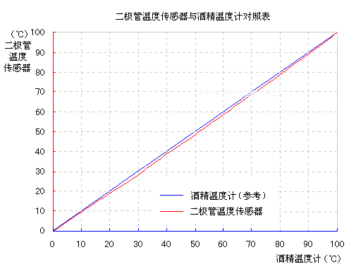 下面显示了以酒精温度计为参考的“二极管温度传感器与温度传感器对比曲线图”。基本上,硅二极管的正向电压降(- 2mV/°C)会随不同的二极管稍有区别,所以其变化曲线不会完全是一条直线。