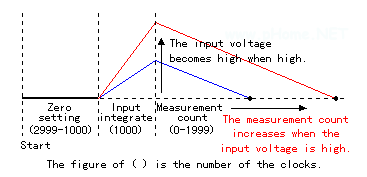 测量的输入电压被转换成一定时间下的电能(即电容的放电时间)。当测量时,电路不会从输入部分吸取能量。因为这些,输入阻抗非常高(大于1G欧姆),输入电子流很小。 ICL7136测量过程如右图所示在1秒内约有3次。