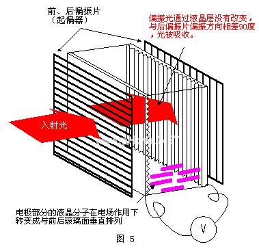 如图5所示,当前后电极加上一定电压时,电极部分的液晶分子在电场作用下转变成与前后玻璃面垂直排列,这时的液晶层失去旋光性。偏振光通过液晶层没有改变,与后偏振片偏振方向相差90度,光被吸收,没有光反射回来,也就看不到反射板。在电极部分出现黑色。由此可知,根据需要制作成不同的电极,就可以实现不同内容的显示。
