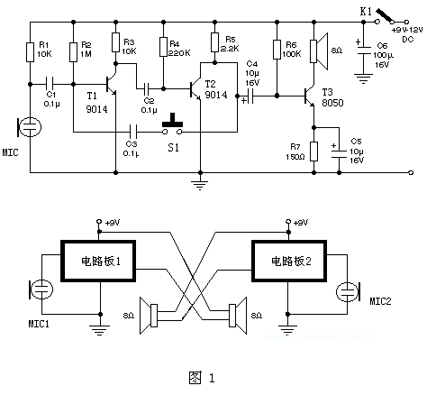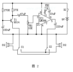 图2是利用普通8欧姆扬声器做话筒又做听筒的对讲机。其中三极管T1采用共基极接法,使其具有良好的电压增益。而且低的输入阻抗可以使电路与8欧姆的扬声器良好地匹配工作。由IC1(LM386)组成的放大器来驱动对方的扬声器工作。VR1用来调节通话音量。调节VR2可控制IC1的总增益。开关S1、S2选用单刀双掷开关。
