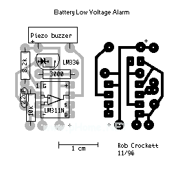 这里介绍的电路主要用于监视用电池供电的设备的电压情况。如航模中,预警电池使用情况,使操作者有时间控制飞机状态,以保证飞机模型能顺利回航。它的电路见下图。图示电路在电压低于4.5V时,开始报警。LM336的上端提供2.5V的参考电压。LM311N为电压比较器。为适应不同电压的监视,可以通过调整8.2k和10k电阻的比值来设置不同的报警电压。