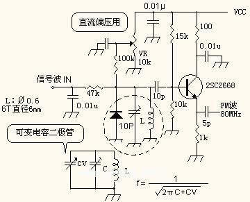 (为了能使电路容易起振,使用fT较高的晶体管。利用可变电容二极管,直接构成FM调变电路。)