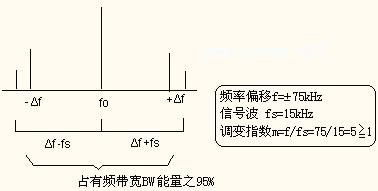 FM调变波所占有的频带宽会随着调变指数(△f/fs)的增大而扩宽。FM调变波的频谱分布范围很广,而只对于存在有95%以上的能量的频带称之为Carson频带宽。在此,对于占有频带宽BW可以概略计算如下。