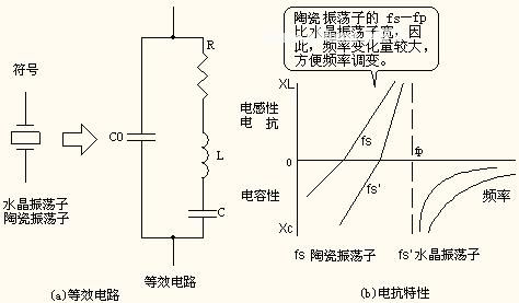 陶瓷振荡器的性能与晶体相似。图4所示的为陶瓷振荡器的电气特性。图(a)为等效电路,图(b)为电抗特性。振荡频率发生电抗为电感性的fs与fp之间