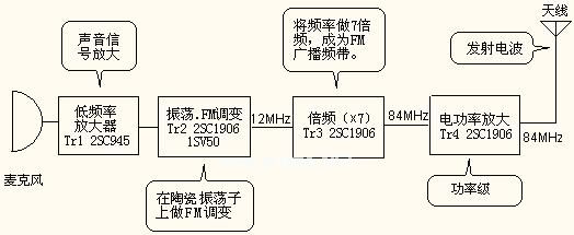 但是,即使陶瓷振荡器的振璗频率再高,也不会高于30MHz,无法直接振荡为FM广播频带的76MHz~90MHz。在此为在12MHz振荡,再7倍频成为84MHz。