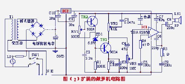 图(2)的做梦机稍为复杂,但在原理上很相似。它可以改变声音的音量和音色,并把电路的输出调整到最大。 RV1调节ZD1的工作条件,使它可以产生最大输出。 TR1把输出放大了许多, RV2调节高频截止的陡度。 IC1把声音放大然后驱动扬声器。