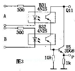 图3电路为“与门”逻辑电路。其逻辑表达式为P=A.B.图中两只光敏管串联,只有当输入逻辑电平A=1、B=1时,输出P=1.同理,还可以组成“或门”、“与非门”、“或非门”等逻辑电路.