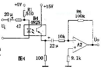 电路如图4所示.这是一个典型的交流耦合放大电路.适当选取发光回路限流电阻Rl,使B4的电流传输比为一常数,即可保证该电路的线性放大作用。