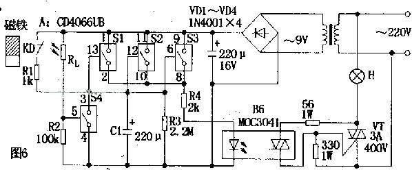 电路如图6所示。A是四组模拟电子开关(S1~S4):S1,S2,S3并联(可增加驱动功率及抗干扰能力)用于延时电路,当其接通电源后经R4,B6驱动双向可控硅VT,VT直接控制门厅照明灯H;S4与外接光敏电阻Rl等构成环境光线检测电路。当门关闭时,安装在门框上的常闭型干簧管KD受到门上磁铁作用,其触点断开,S1,S2,S3处于数据开状态。晚间主人回家打开门,磁铁远离KD,KD触点闭合。此时9V电源整流后经R1向C1充电,C1两端电压很快上升到9V,整流电压经S1,S2,S3和R4使B6内发光管发光从而触发双向可控硅导通,VT亦导通,H点亮,实现自动照明控制作用。房门关闭后,磁铁控制KD,触点断开,9V电源停止对C1充电,电路进入延时状态。C1开始对R3放电,经一段时间延迟后,C1两端电压逐渐下降到S1,S2,S3的开启电压(1.5v)以下,S1,S2,S3恢复断开状态,导致B6截止,VT亦截止,H熄来,实现延时关灯功能。