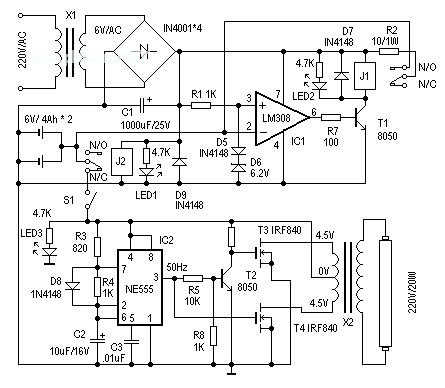 由IC2(NE555)、T2、T3、T4、X2等组成应急灯电路。IC2组成50Hz信号发生器,由IC2的3脚输出50Hz信号,经T2反相、放大分别驱动由T3、T4、X2组成的推挽电路,在X2的高压侧感应出220V的交流电,使日光灯管点亮。这里的X2可以直接使用次级为4.5伏、初级为220V的成品电源变压器,功率试日光灯管的功率而定。使用时,注意T3、T4应加散热器。