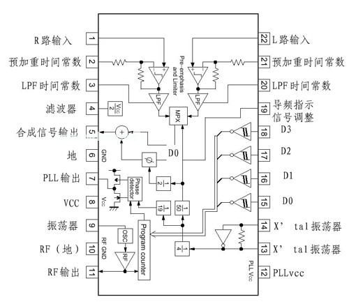 {1} 和 {22} 脚为左右声道信号输入端。 {2} 和 {21} 脚连接预加重电路,可由外接的电路改变时间常数(T=22.7kΩ×C)。 {3} 和 {20} 脚为低通滤波器的可调端,外接150pF的电容可限制15kHz以上信号的输入。 {4} 脚为滤波端,外接电容可改善参考电压的波纹系数。 {5} 脚是立体声复合信号的输出端。 {6} 脚接地, {7} 脚为PLL鉴相器输出。 {8} 脚为电源端,连接+5V电源。 {9} 脚为RF振荡器端,由其与外围元件构成压控振荡电路。 {10} 脚为RF接地端。 {11} 脚为RF信号输出端,经带通滤波器连接至天线或后级功放。 {12} 脚为PLL电源端。 {13} 、 {14} 脚外接一7.6MHz晶振。 {15} ~ {18} 脚为并行数据设置端,由它们控制发射器的输出频率, {19} 脚为导频信号调整端。