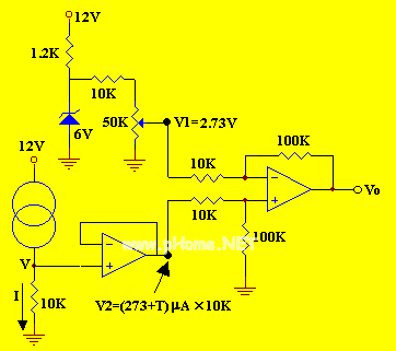 其输出电流是以绝对温度零度(-273℃)为基准,每增加1℃,它会增加1μA输出电流,因此在室温25℃时,其输出电流Iout=(273+25)=298μA。