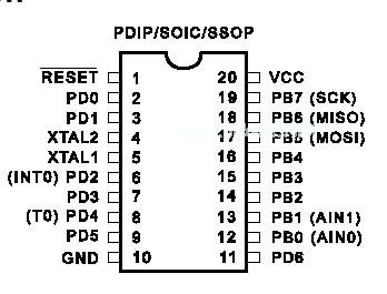 上面的电路图为ATMEL公司提供的电路,改进后的电路跟上面的电路类似.下载线使用AT90S1200单片机.AT90S1200的单片机的引脚如下: