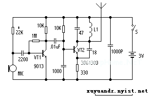 音频放大器由VT1等组成,放大后的音频信号经C2(0.01uF)耦合至高频振荡电路VT2基极。高频振荡电路VT2工作频率在88-108MHz,这个频率由振荡线圈L1和C4(47P)电容决定,它受VT1的音频信号调频。当音频信号经C2耦合至VT2基极时,改变振荡器频率,产生所需要的FM(调频)信号,经天线发射至空中。