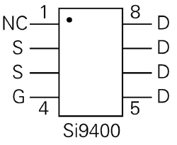 Si9400是P沟道功率MOSFET,其主要参数是VDS=-20V,在VGS =-10V时RDS(ON)=0.25Ω,ID=±2.5A。8管脚SO封装,管脚排列如图3所示,使用时,四个D要焊在一起,两个S要焊在一起以便于散热。