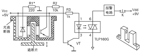 光遮断器安装在抽屉的底部,遮断片装在抽屉上,如图5所示。要使防盗报警器工作,接通Vcc(+5V)及Vdd(+9V)。抽屉未被撬时,遮断片遮住光路,光电三极管截止,VT无ID,VT也截止,光耦(TLP169G)的发光二极管无电流,光触发双向可控硅截止,报警电路不工作。