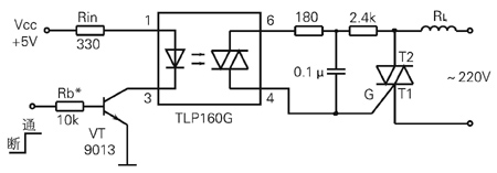 TLP160G光耦用得最广的是用作交流固态继电器。它可以与外接双向可控硅作简单连接来驱动市电供电的各种负载。其电路如图7所示。输入三极管VT的基极的控制信号为高电平时,VT导通,红外发光二极管也导通(VCC 经RIN、红外发光二极管、经VT的C、E极到地),光触发双向可控硅导通;这使外接功率较大的三端双向可控硅导通,负载RL得电。其工作原理相当于图8中的控制开关:K闭合,双向可控硅导通;K断开,双向可控硅截止。