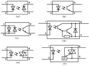 这里要说明的是,图2(c)的输入部分有两个背对背的红外发光二极管,它用于交流输入的场合;图2(d)采用达林顿输出结构,它可使输出获得较大的电流;图2(e)、2(f)的输出由光触发双向可控硅组成,它们主要用来驱动交流负载。图2(e)与图2(f)的差别是图2(f)有过零触发控制(图中的“ZC”即“过零”的意思),而图2(e)没有过零触发控制电路。