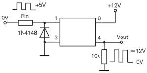 从图3(a)可以看出;输入端不加Vcc电压,输出端Vout=0V,输入端加了Vcc电压,负载得电,这个功能相当于“继电器”。如果在输入端加幅值为5V的脉冲(如图4所示),输出端Vdd=12V,RL=10kΩ,则输出的脉冲幅值接近12V,从这功一能来看,相当于“变压器”;若输入电压从0跃变到+5V,输出则从0跃变到接近12V,它又可用作电平转换。