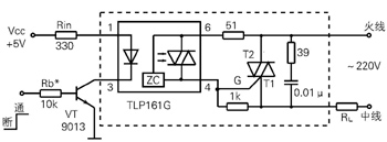 采用内部有交流电过零时触发电路(图10中的“ZC”部分)的ILP161G光耦,可以做成过零触发交流固态继电器电路,如图10所示。它能在交流电过零附近触发双向可控硅,使交流波形完整,不会造成对电网的干扰。其工作原理与图9相同。图中的39Ω及0.01μF RC电路是一种浪涌电压吸收回路,它用来保护双向可控硅免于瞬态的过压而损坏。外接的三端双向可控硅选择方法与图9电路相同。