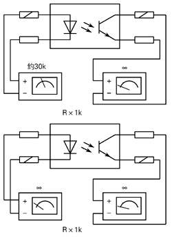 由于它是一个二极管及一个三极管c、e极组成的,所以用R×1k挡来测量是十分方便的。只要测出一个二极管:黑表笔接二极管的阳极,红表笔接二极管的阴极,其阻值约30kΩ,则黑表笔端即1脚。如图7所示,其它三种测量都应是R=∞(表笔不动)。若光电三极管的测量电阻不是∞,则此光耦不能用。