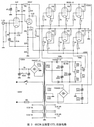 对于普通功率电子管改成三极管接法的OTL功放来说,并不是所有功率管均能采用,必须选用屏极电压范围较大的束射四极管或五极功率电子管,如6KD6、6L6、6P3P、6146等。同时,功放级还必须采用多只功率管并联的方式,在8Ω低阻抗负载时,每声道采用6只功率管并联才能符合低阻抗负载的要求,并且输出功率仅为30W 左右。