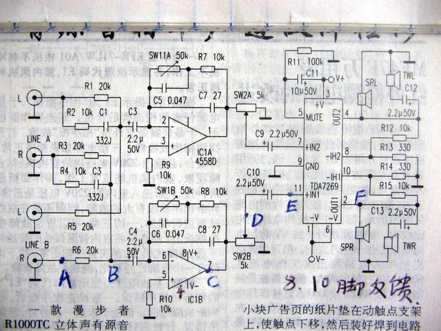 若是左声道电路自身的故障,改如何检修呢??我们看看图纸,图中我标了A、B、C、D、E、.几个“关键点”。IC1B为右声道前置电路,采用“信号注入法 ”(也叫信号干扰法),由后级往前级依次注入干扰信号,注入的次序依次为:E,D,C,B,A.每个关键点注入信号时,右声道喇叭应该有较大的“喀喀”干扰声。直到查出故障位置。