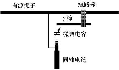 八木天线的匹配方法有多种形式。图2是γ匹配连接示意图。同轴电缆的芯线经过可变电容与γ棒相连,电缆屏蔽层接在有源振子的中心,短路棒将有源振子与γ棒连通并可以移动。调整可变电容容量及短路棒位置能使天线达到匹配状态。γ匹配为不平衡型,可以直接与同轴电缆连接,是业余无线电爱好者喜爱的一种很方便的匹配方式。