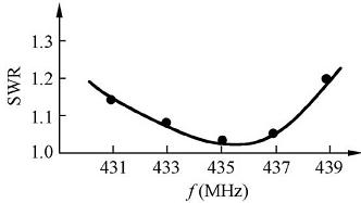 (4)观察驻波最小时所对应的频率(天线谐振频率)是否在435MHz附近,若频率偏高或偏低,可更换一根稍长或稍短几毫米的有源振子重新测量驻波;