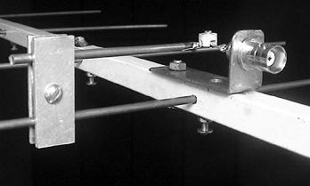 找一块60 mm×15mm、厚1mm的铁片,弯成直角并钻好孔。长边固定在横杆上,短边装上BNC插座,插座的中心到有源振子的垂直距离约20mm。将铁片与方管间的油漆锉掉以保证接触良好。短路棒可找两块尺寸为30 mm×10mm、厚约1—2mm的铝片或铜片制作。在两块铝片中间打一个孔,装上螺钉,夹在有源振子和γ棒上,调整这二根铜棒的间距在20mm,如图4所示。最后将瓷片电容焊在BNC插座的芯线及γ棒上,天线制作便完成了。