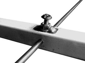 天线制作所需材料参见表2,所有振子均选用Φ3mm的铜焊条,横杆可用15mm×15mm、长70cm的方管或铝合金材料。首先按照表1的尺寸剪好6根铜棒,在方管相应位置上做好打孔记号。选用Φ3mm钻头,用台钻在方管的5个孔位上将方管打穿,使铜焊条刚好能插进横杆。为便于调整、拆卸,可在振子的上方再钻一个孔,焊上一个螺母,旋紧螺杆,就可以将振子固定住。见图3。注意在方管上打孔最好用台钻,用手枪钻不易控制方向,容易造成振子倾斜。