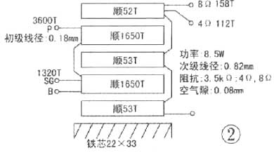 输出变压器是电子管功放电路的重要部件,如果自制条件不具备,可以构买成品。本机所用输出变压器的具体参数见图2。铁芯为22×33冷轧硅钢片,初极共3300圈,分两层。线径为0.18mm;次级共172圈,分三层,所用线径为0.82mm。EI硅钢片所留空气隙为0.08mm、最大工作电流70mA、功率为8.5W。