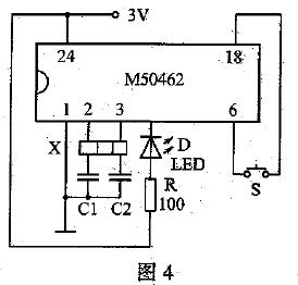 陶瓷振子检测电路如图4所示,外接元件455kHz或500kHz陶瓷振子X,C1、c2与集成电路M50462的2、3脚内部电路组成455kHz或500kHz的振荡电路,将被测的455kHz或500kHz陶瓷振子插入插孔中,接通电源,按住按钮开关S时,发光二极管能不停地闪烁发光,则说明被测陶瓷振子是好的。