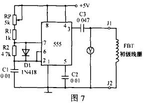 行输出变压器检测电路如图7所示,555集成定时器与外接元件构成多谐振荡器。调节RP可产生12.5~25kHz的方波脉冲,由3脚经C3耦合输出作为FBT初级线圈电谐振的激励脉冲,C3与FBT初级线圈组成一串联谐振电路。