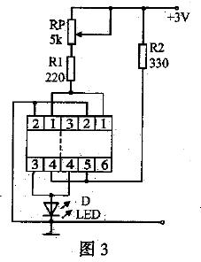 光电耦合器检测电路如图3所示,可将TLP621等四个引脚的光电耦合器插入插座左端的四个引脚的插孔中,将TLP332等六个引脚的光电耦合器插入插座右端的六个引脚的插孔中。接通电源后,电源经RP、R1给IC中的发光二极管提供一个正向电压,发光二极管发光,使IC中的光电三极管导通,3脚外接的发光二极管D发光,若调节RP时,发光二极管的亮度能跟着变化,则被测光电耦合器是好的。
