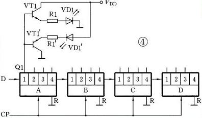 晶体管VT1~VT15构成15个NPN型射极跟随器,分别控制发光二极管VD1~VD15。晶体管VT1'~VT15'构成15个PNP型射极跟随器,分别控制发光二极管VD1'~VD15'。15位移位寄存器的每一位寄存单元的Q输出端,同时接有NPN型(VT)和PNP型(VT')两个射极跟随器。以第一寄存单元为例:当Q=1时,NPN晶体管VT1导通,发光二极管VD1亮;同时PNP晶体管VT'截止,发光二极管VD1'熄灭。当Q=0时,NPN晶体管VT1截止,VD1灭;PNP晶体管VT1'导通,VD1'亮。