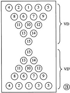 在结构上,两组各15个发光二极管分别排列成为两个三角形,如图3所示。其中:VD1~VD15位于上部,排列成倒三角形;VD1'~VD15'位于下部,排列成正三角形。两个三角形的顶尖相对,组成沙漏形状。当上部有一个发光二极管熄灭时,相应地下部就有一个发光二极管点亮,模拟了沙漏的运动。