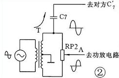 消侧音电路的调试稍复杂一点,在T的原边加入0.5Vp-p的音频信号,将功放音量调至最大,调节RP2使功放输出越小越好。