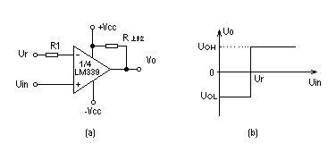 图2a给出了一个基本单限比较器。输入信号Uin,即待比较电压,它加到同相输入端,在反相输入端接一个参考电压(门限电平)Ur。当输入电压Uin>Ur时,输出为高电平UOH。图2b为其传输特性。