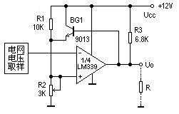 图6为某电磁炉电路中电网过电压检测电路部分。电网电压正常时,1/4LM339的U4<2.8V,U5=2.8V,输出开路,过电压保护电路不工作,作为正反馈的射极跟随器BG1是导通的。当电网电压大于242V时,U4>2.8V,比较器翻转,输出为0V,BG1截止,U5的电压就完全决定于R1与R2的分压值,为2.7V,促使U4更大于U5,这就使翻转后的状态极为稳定,避免了过压点附近由于电网电压很小的波动而引起的不稳定的现象。由于制造了一定的回差(迟滞),在过电压保护后,电网电压要降到242-5=237V时,U4<U3,电磁炉才又开始工作。这正是我们所期望的。