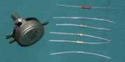 | 金属膜电阻 | 在真空中加热合金,合金蒸发,使 瓷棒表面形成一层导电金属膜。刻槽和 改变金属膜厚度可以控制阻值。这种电 阻和碳膜电阻相比,体积小、噪声低、 稳定性好,但成本较高。 | ![]() |