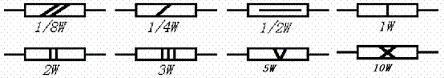 额定功率:在规定的环境温度和湿度下,假定周围空气不流通,在长期连续负载而不损坏或基本不改变性能的情况下,电阻器上允许消耗的最大功率。为保证安全使用,一般选其额定功率比它在电路中消耗的功率高1-2倍。额定功率分19个等级,常用的有 0.05W、0.125W、0.25W、0.5W、1W、2W、3W、5W、7W、10W,在电路图中非线绕电阻器额定功率的符号表示如下图: