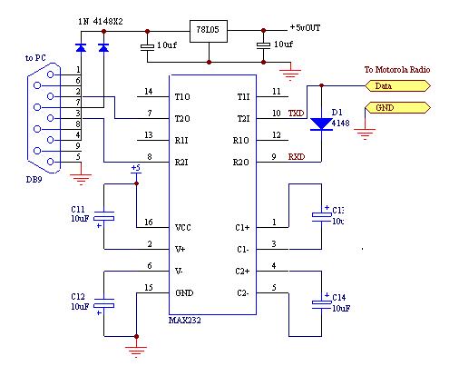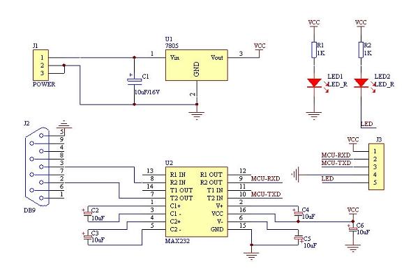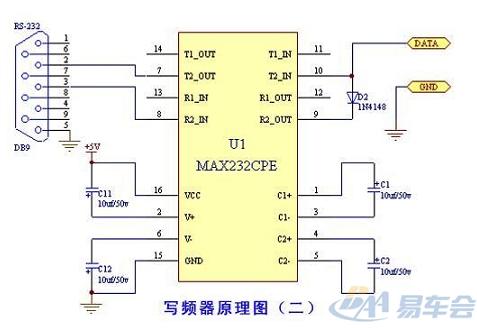 下面我们来看看两张写频器的电路图,这两个图都是用了MAX232这个电脑串口电平转换专用芯片,它有着兼容性好、稳定性好、外围电路简单、容易制作等优点。