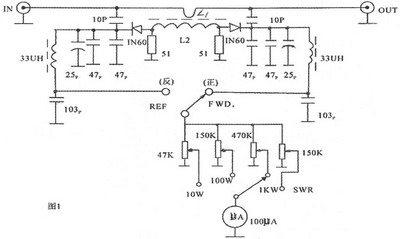 在图中看到要想电桥平衡,因C1、C2、R均为固定值,只有改动高频线圈L2的圈数才能使电桥平衡。而有些资料强调要调整两只分压电容来调平衡,实践证明微调分压电容,虽有作用,也只是微量的变化,而调整线圈却可大幅度的调整平衡。磁环的材质在这里尤为重要。笔者试用过几种国产磁环,有些高频磁环虽能在29.6兆赫芝工作,但放在驻波表里就不灵了。平衡到一定程度后,锐点就没了,反复加减圈数也无效,怎么也不能把REF档的电流调到表头的零点位置。(此时也可多找几种磁环试试)