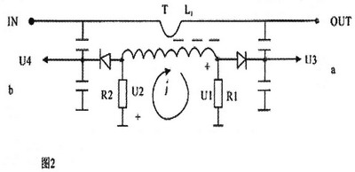 (如图)首先分析它的高频电路。把它画成等效电路来分析。设正向电压为U入、反向电压为U反。在a、b两点上,为什么能得到独立的U入和U反电压呢?如果U入和U反的电压不能单独的分离出来,是不能进行正向波、反向波的测试的。首先要从传输线L1上取出U入和U反电压。当L1上有高频电流通过时,必然在高频变压器T的次级线圈L2上产生一感应电动势。