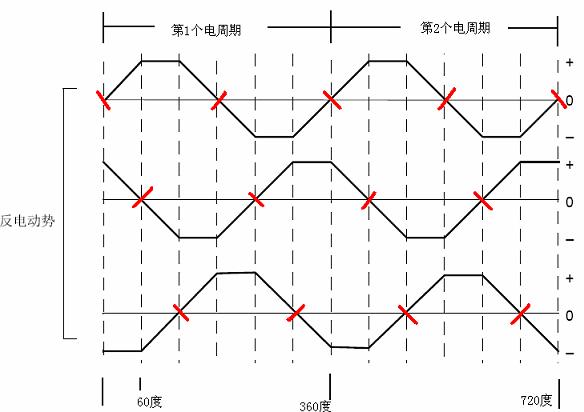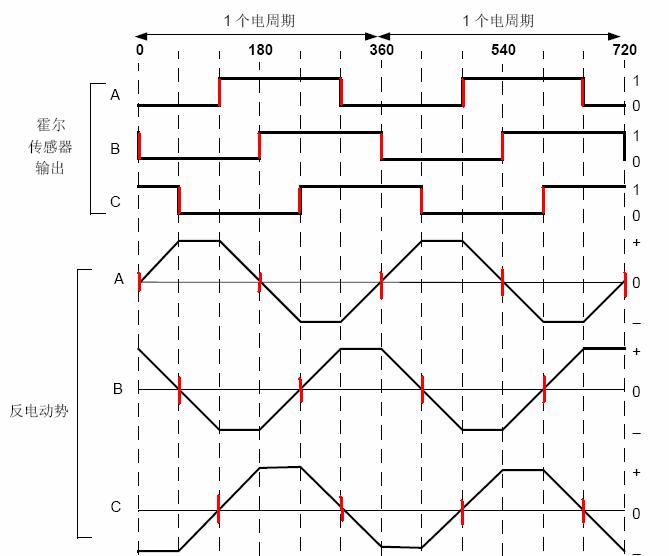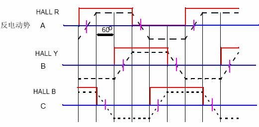 理想的反电动势波形和霍尔传感器输出波形对比图,从图中可看出,反电动势的过零点和霍尔传感器的波形翻转同步,如果用此反电动势过零信号进行程序换相会获得和有感无刷电机一样的运转性能。