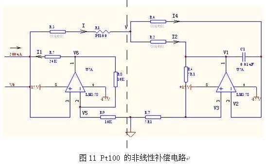 根据上述补偿思想,设计的补偿电路如图11所示,通过动态调整流过Pt100的电流来实现电压输出非线性的补偿,同时考虑到热电阻的安装需要较长的导线,因此设计的电路也兼顾引线补偿功能,下面对本电路的工作原理给以分析说明。