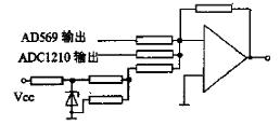 最后,由于AD569与ADC1210组合输出,其中ADC1210能够补偿的范围应在0.1~0.01mV,因此要求ADC1210必须可进行正负两个方向的补偿,所以,设计中将ADC1210转换中值点即2048个数位处设置为零位,由于此时ADC1210的输出接近5V,比例调节后也为0.005V,因此为了使合成后的输出电压对应零位,要求AD569输出0.005V的电压且与ADC1210的输出反向,从而抵消ADC1210零点没置的电压输出。但实际中,不可能完全将零位电压补偿为零,因此必须设置外部调零电路,电路如图3所示。