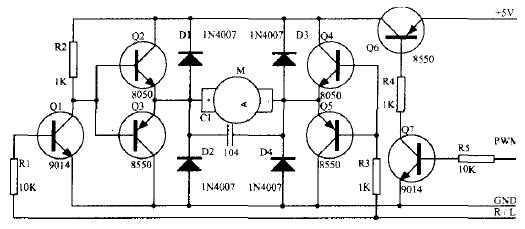 本电路有钳位二极管、保护电容,同时具备正反转和调速功能,在3~12V供电的微型直流电机的驱动中几乎是通用电路。但驱动能力也有一定限度,使用的元件太多,成本是一个方面,一旦出现故障将无从下手,只能报废,而且仅能驱动一台微型直流电动机。